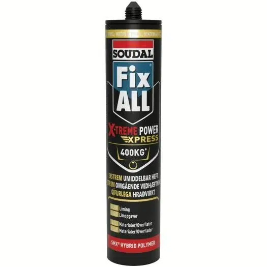 Fix ALL X-treme Power Express er den beste monteringslimen til tek:STILLE, Tre-spill og Kokosnøtt. Vi har testet limen nøye på produktene sammen med produsent. Limen gir umiddelbar heft og ikke sig. Fix All Extreme er et miljøvennlig produkt uten løsemidler, har høy mekanisk yteevne, vannfast og er UV- resistent. Du påfører limen enkelt med en fugepistol. Fix ALL® X-treme Power Express er i stand til å bære opptil 400 kg/m² med sin utrolige innledende gripestyrke. Det hurtigherdende limet er overflatetørt etter bare 30 minutter. Etter fullstendig herding er styrken enda høyere.