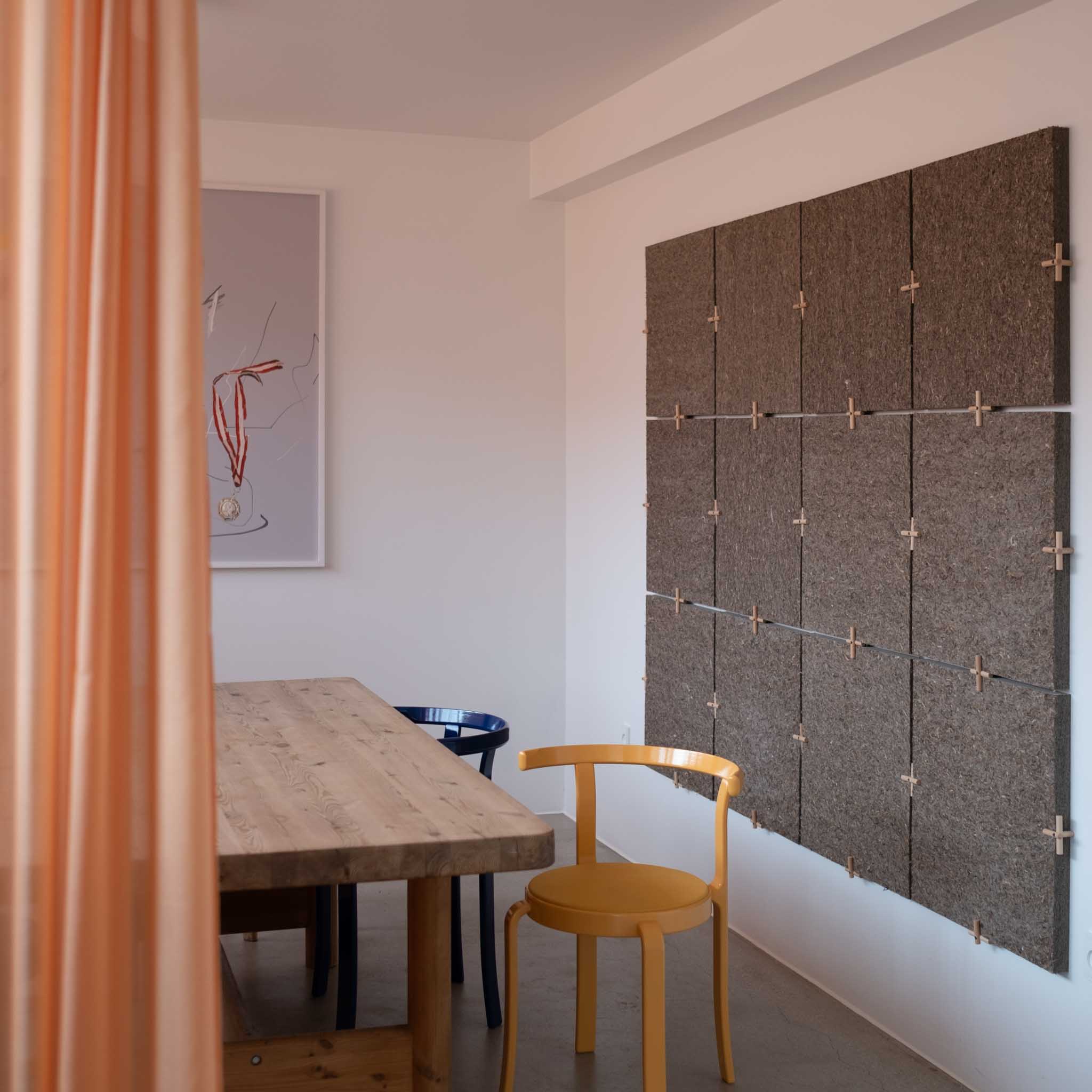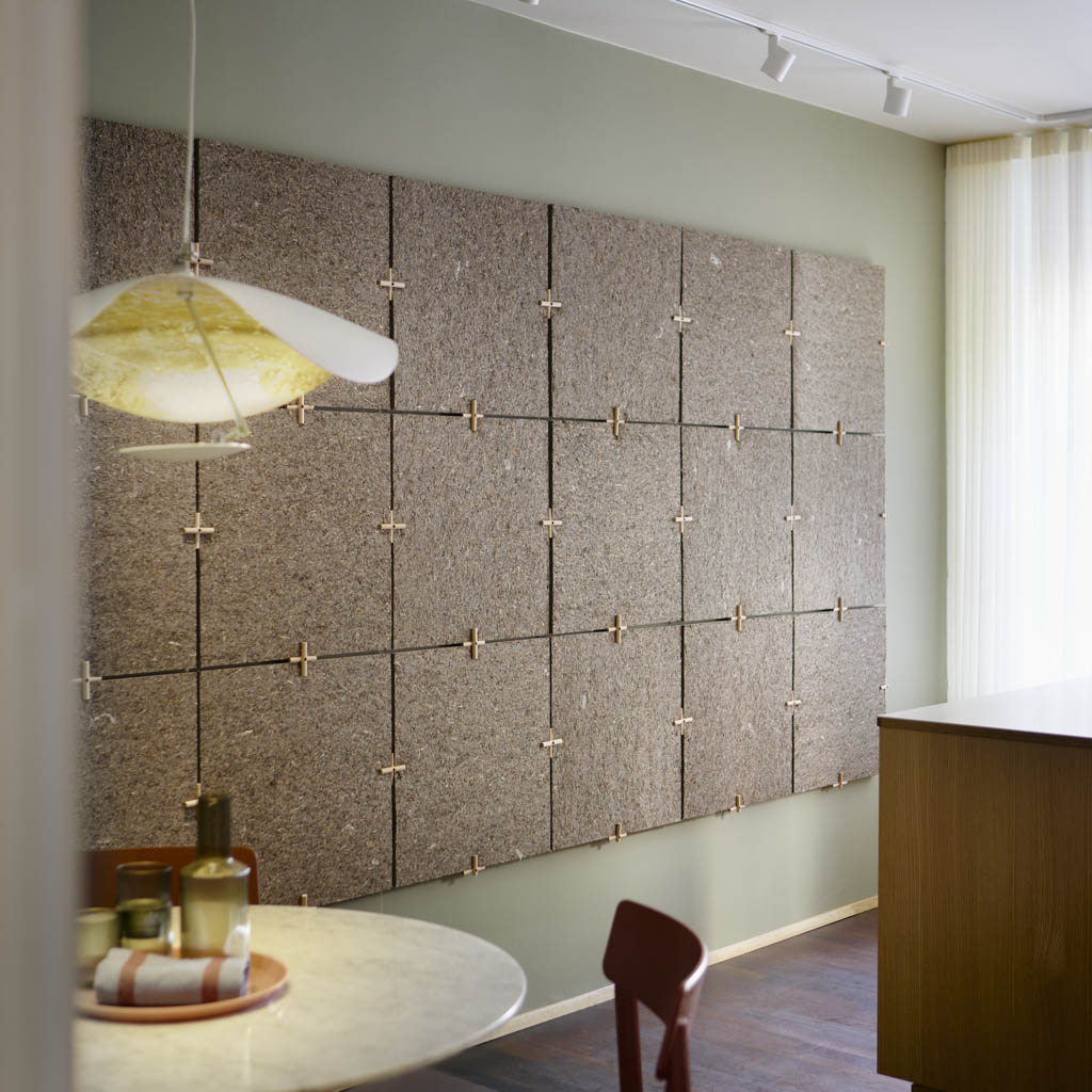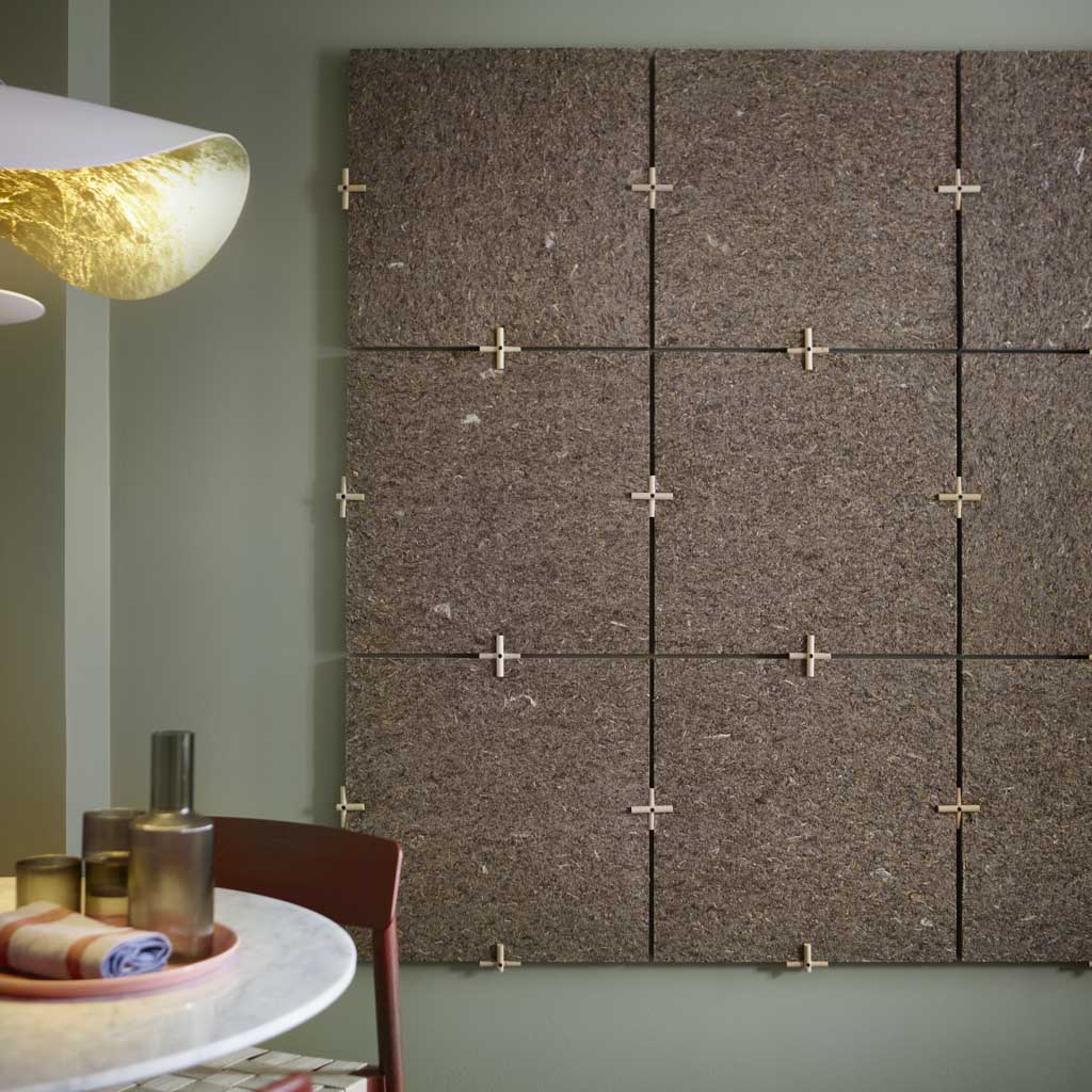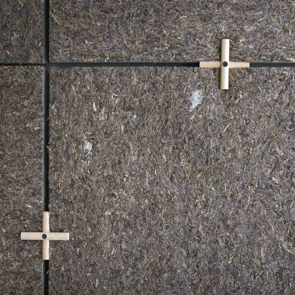 Akustikkmattene sammenføyes med trekoblinger laget av bøk. Det gir en minimalistiske og allsidige løsning – hvor materialets naturlige uttrykk kommer veldig godt fram. Mattene holdes sammen av spesialdesignede trekoblinger, som binder elementene sammen på en elegant og funksjonell måte. Når flere monteres i serie, skapes et mønster av rene linjer og struktur – subtilt fremhevet av selve sammenføyningene.